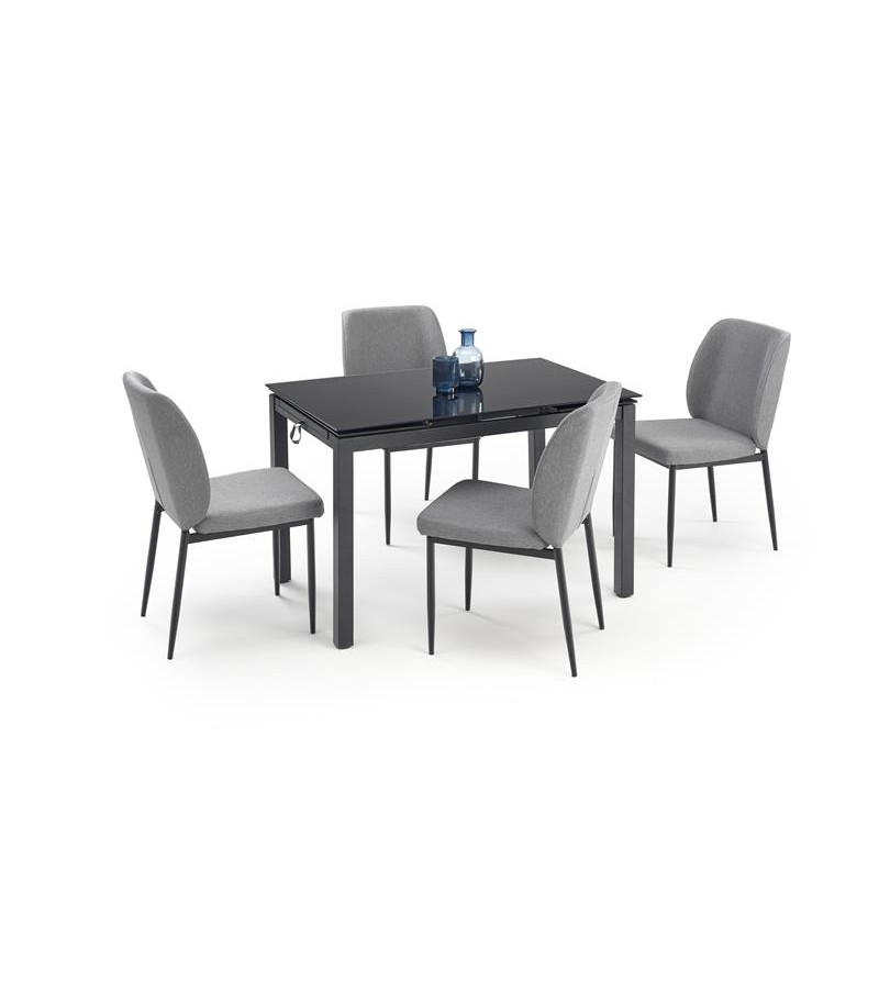 Egy étkezőasztal és négy szék vásárlása nagyszerű módja annak, hogy szebbé tegye otthonát. A JASPER étkezőgarnitúra egy bővíthető asztalból áll, melynek szélessége 170 cm-ig bővíthető, így kisebb és nagyobb helyiségekbe is ideális. Az acél lábak és a fekete üveglap elegáns megjelenést kölcsönöznek, amely biztosan jól passzol a különböző stílusokhoz.