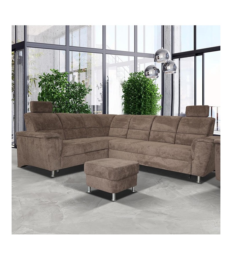 Szövetborítású ülőgarnitúra ágyfunkcióval és ágyneműtartóval, állítható fejtámlakkal, jobb és balos kivitelben, szövet: Matrix 5 – barna és Matrix 17 – szürke, sarok mérete (Szé/Ma/Mé): 267x86/114x217 cm, fekvőfelület (Szé/Ho): 118x200 cm, ülőmagasság/ülőmélység: 41x53 cm, fotel (Szé/Ma/Mé): 112x114x92 cm, taburett (Szé/Ma/Mé): 58x41x58 cm.