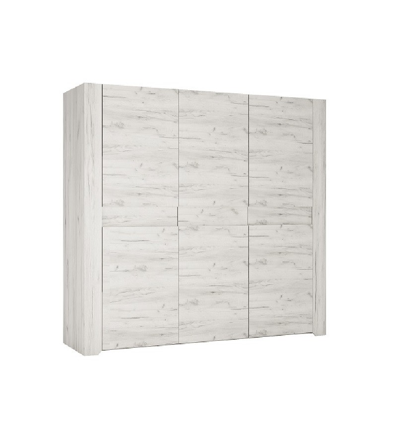 Je trojdverová, rozdelená na jednu policovú časť a dve vešiakové časti. V skrini máte k dispozícií až štyri vešiakové tyče. Policová časť je piatimi policami rozdelená na šesť úložných priestorov. Dvere sú bez úchytiek, samotné dvere sú riešené tak, že ich potiahnutím v stredovej časti ľahko otvoríte.