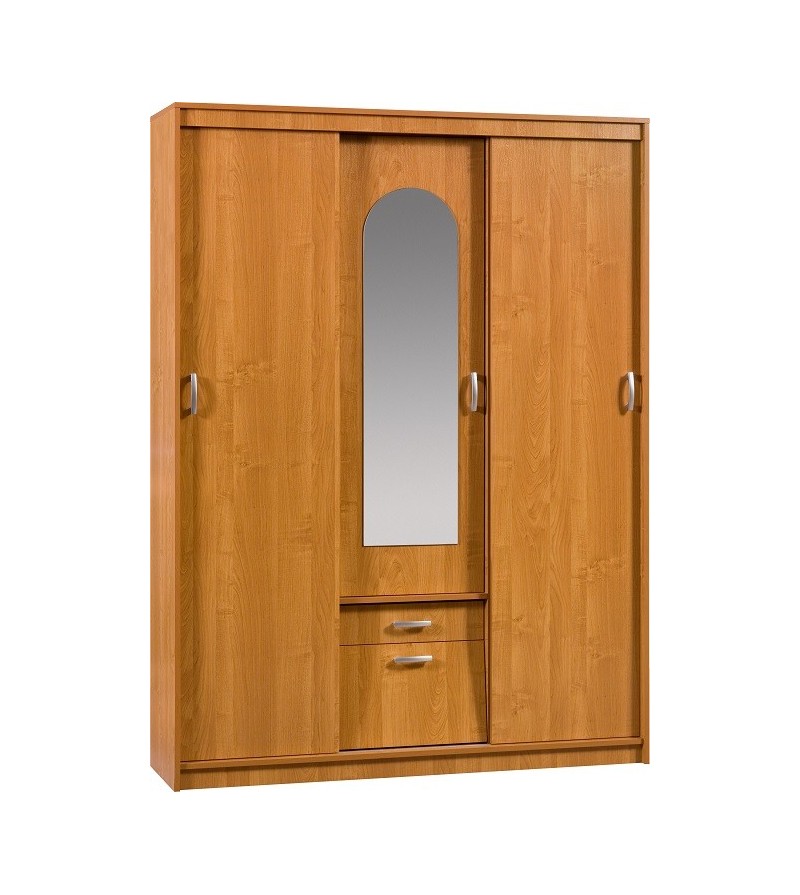 Kombinált tolóajtós szekrény akasztóval, polcokkal és tükörrel.