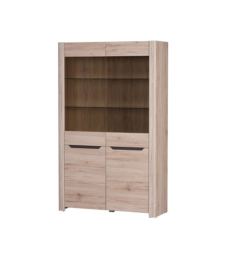 Elegáns vitrin a Desio elemes bútorkollekcióból időtálló színkivitelben. Sötét díszléce egy érdekes csavart jelent megjelenésében. Két ajtaja részben üvegezett, mögötte üveg és fa polcok találhatóak.