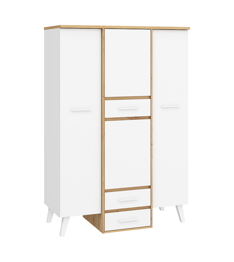 Kombinált szekrény a Nordis bútorcsaládból széles színválasztékban. Két oldalon az ajtók mögött vállfarudak találhatóak, ezen kívül középső polcos résszel és két fiókkal szerelve.