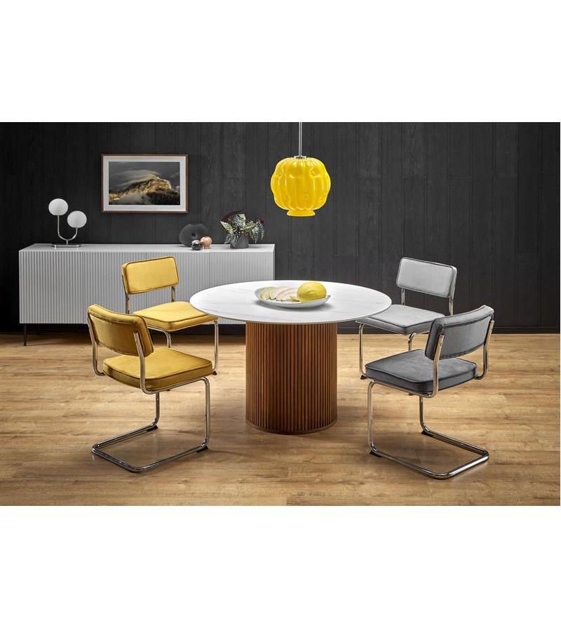 BRUNO je okrúhly jedálenský stôl s moderným dizajnom. Kombinácia bieleho mramoru s okrúhlym podstavcom robí zo stola mimoriadne originálny kus nábytku. Stôl je dodávaný samostatne, stoličky nie sú súčasťou.