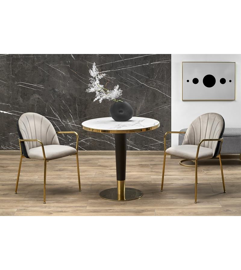 Ak hľadáte krásny a štýlový stôl, ktorý vynikne vo vašom interiéri, stôl MORATA s okrúhlou doskou, zlatými prvkami a keramickou doskou bude tou správnou voľbou!