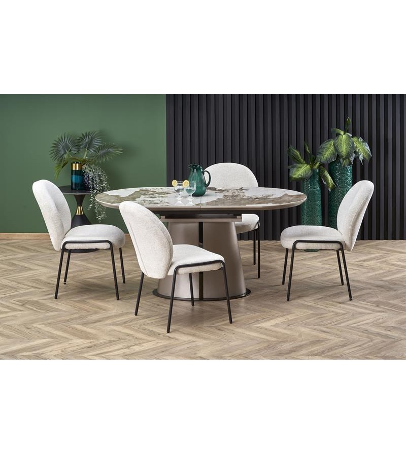 Jedálenský stôl ROBINSON je nielen praktickým riešením pre váš domov, ale aj štýlovým doplnkom, ktorý skvele doplní Váš interiér. Keramická stolová doska s výrazným kamenným vzorom je nielen veľmi odolná, ale pôsobí aj veľmi elegantne a upúta pozornosť hostí. Vzory kamienkov s výraznými farbami a vzormi sú teraz mimoriadne módne a nahradili jemné vzory prítomné v posledných rokoch. Oceľová noha vo farbe cappuccino zaisťuje stabilitu a odolnosť, vďaka čomu vám tento stôl bude slúžiť dlhé roky.