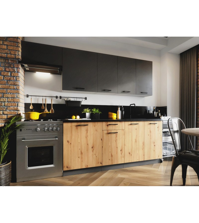 Kuchynská zostava Clara pre kuchyňu v priemyselnom štýle predstaví zaujímavú kombináciu teplej farby dub Artisan s tmavým odtieňom čelných plôch horných skriniek - šedá Graphite.