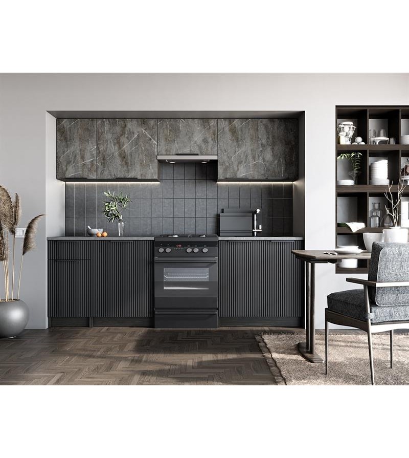 Pokiaľ hľadáte nábytok s elegantným a moderným vzhľadom, kuchynská zostava TAMARA bude dokonalým riešením. Čelá horných skriniek sú vo farbe sivého mramoru, spodné skrinky sú z trendy drážkovanej čiernej MDF. Pracovná doska je vyrobená v hrúbke 28 mm v sivej farbe a dokonale ladí s ostatnými prvkami. Pánty skriniek sú opatrené plynovými piestami. Kuchynská linka je dodávaná bez drezu. Možnosť doobjednať.